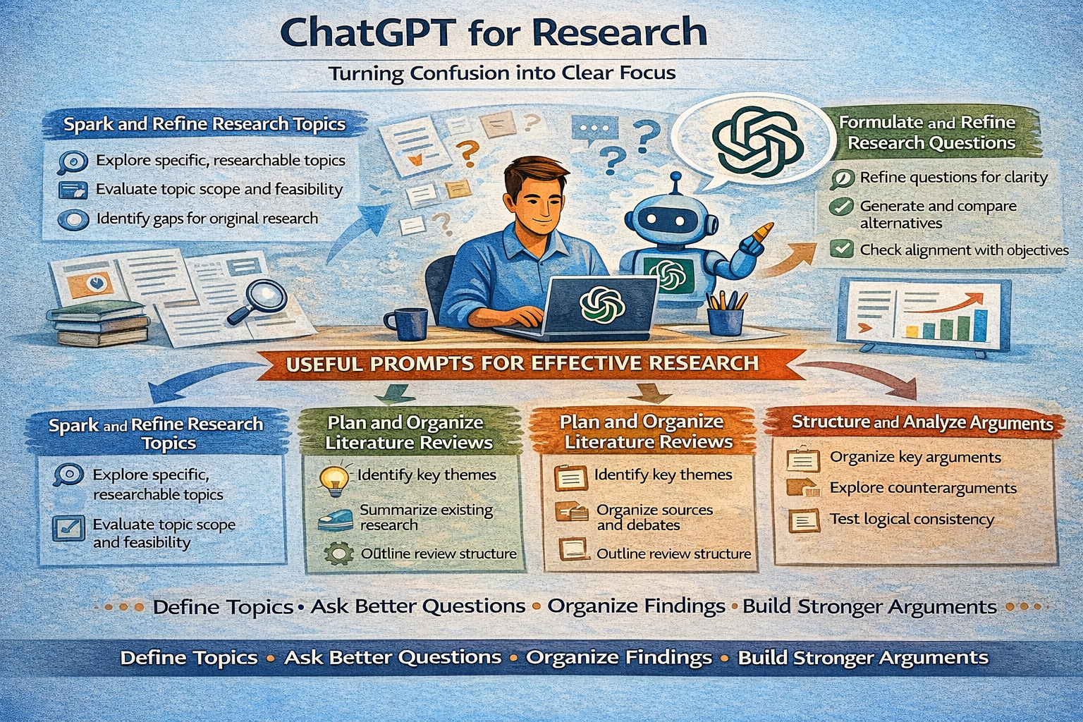 ChatGPT Prompts for Research (A Practical Guide for Academic and Professional Studies) Somnath Gandotra, February 8, 2026February 9, 2026 Research rarely begins with clarity. More often, it starts with confusion, scattered ideas, and an overwhelming volume of information. Whether the work is academic, professional, or exploratory, the hardest part is usually deciding what to focus on and how to move forward. This is where ChatGPT prompts for research are becoming genuinely valuable. Not as a replacement for rigorous thinking or subject expertise, but as a structured way to refine questions, explore literature, and organize reasoning. The real strength of ChatGPT in research is not producing answers. It is helping researchers ask better questions earlier in the process. A well written prompt forces intent, scope, and direction before time is spent reading papers or analyzing data. This guide explains how to use ChatGPT prompts for research in a practical and responsible way, with real prompt examples that match how research is actually done. Why ChatGPT Prompts Matter in Research Most research problems do not fail due to lack of information. They fail because the research question is too broad, too vague, or poorly framed. Without clarity, even high quality sources lead to weak conclusions. ChatGPT prompts help researchers slow down and structure their thinking. Writing a good prompt requires defining: • The research goal• The scope and boundaries• Key assumptions and constraints• The type of output needed Used correctly, prompts can support: • Topic exploration• Research question refinement• Literature review planning• Argument structuring• Research documentation The quality of insight always depends on the quality of the prompt. ChatGPT Prompts for Research Topic Exploration Choosing a research topic is often the most difficult step. Prompt to Explore Research Topics Suggest research topics related to this general area. Focus on topics that are specific, researchable, and relevant to current academic or industry discussions. This helps narrow broad interests into workable topics. Prompt to Evaluate Topic Feasibility Evaluate this research topic in terms of scope, availability of sources, and potential challenges. Suggest ways to narrow or refine it. This prevents choosing topics that are too large or impractical. Prompt to Identify Research Gaps Based on this topic, identify gaps or under explored areas that could be addressed through original research. Research gaps often lead to stronger contributions. ChatGPT Prompts for Formulating Research Questions Strong research questions drive strong research. Prompt to Refine a Research Question Help refine this research question to make it clearer, more focused, and suitable for formal research. This improves precision and direction. Prompt to Generate Alternative Questions Generate alternative research questions based on this topic, each with a different focus. This allows researchers to compare angles. Prompt to Check Alignment With Objectives Evaluate whether this research question aligns with the stated research objectives and constraints. Alignment prevents wasted effort later. ChatGPT Prompts for Literature Review Support Literature reviews are time intensive and mentally demanding. Prompt to Identify Key Themes Based on this research topic, list key themes and concepts commonly discussed in the literature. This helps organize reading early. Prompt to Summarize Existing Research Summarize the main findings and debates related to this research topic at a high level. This provides context before deep reading. Prompt to Organize Literature Review Structure Suggest a logical structure for a literature review based on themes, methods, or theoretical perspectives. Structure improves coherence. ChatGPT Prompts for Research Methodology Planning Methodology defines credibility. Prompt to Compare Research Methods Compare qualitative and quantitative approaches for this research question. Explain strengths, limitations, and suitability. This supports method selection. Prompt to Design a Research Approach Suggest a research methodology including data sources, sampling approach, and potential limitations. This helps avoid vague methods sections. Prompt to Identify Ethical Considerations Identify potential ethical concerns associated with this research topic and methodology. Ethics should be addressed early. ChatGPT Prompts for Structuring Arguments and Analysis Strong arguments are built, not assumed. Prompt to Organize Key Arguments Help organize the main arguments for this research topic into a logical sequence with supporting points. This improves flow. Prompt to Test Logical Consistency Review this argument structure and identify logical gaps, weak assumptions, or unsupported claims. This strengthens reasoning. Prompt to Explore Counterarguments List potential counterarguments to this position and suggest how they could be addressed. Balanced research builds credibility. ChatGPT Prompts for Writing and Drafting Research Content Writing is where ideas become visible. Prompt to Draft Section Content Draft an introduction for this research topic that clearly states the problem, importance, and scope. This supports strong openings. Prompt to Improve Academic Tone Rewrite this paragraph to improve clarity and maintain a formal academic tone. This helps refine drafts. Prompt to Simplify Complex Explanations Rewrite this explanation in clearer language without reducing academic accuracy. Clarity matters even in formal writing. ChatGPT Prompts for Research Review and Revision Revision improves quality. Prompt to Identify Weak Areas Review this research draft and identify areas that need stronger evidence or clarification. This supports targeted revision. Prompt to Improve Coherence Suggest improvements to flow and transitions between sections of this research paper. Flow improves readability. Prompt to Check Alignment With Objectives E